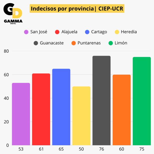 Según el CIEP, el PPSO recibe un apoyo del 19% en Heredia y del 18% en Guanacaste y Puntarenas, mientras que en Limón obtiene apenas el 3,5% y en Cartago el 12%.