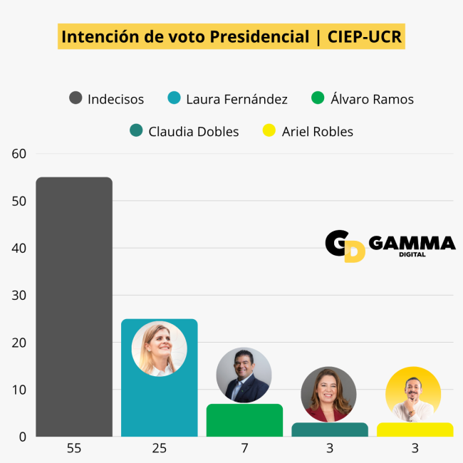 Según la casa encuestadora, Fernández obtiene el 25% del respaldo; seguido por el candidato del Partido Liberación Nacional (PLN), Álvaro Ramos con un 7% y la exprimera dama, Claudia Dobles empatada con el frenteamplista Ariel Robles, ambos con un 3%.